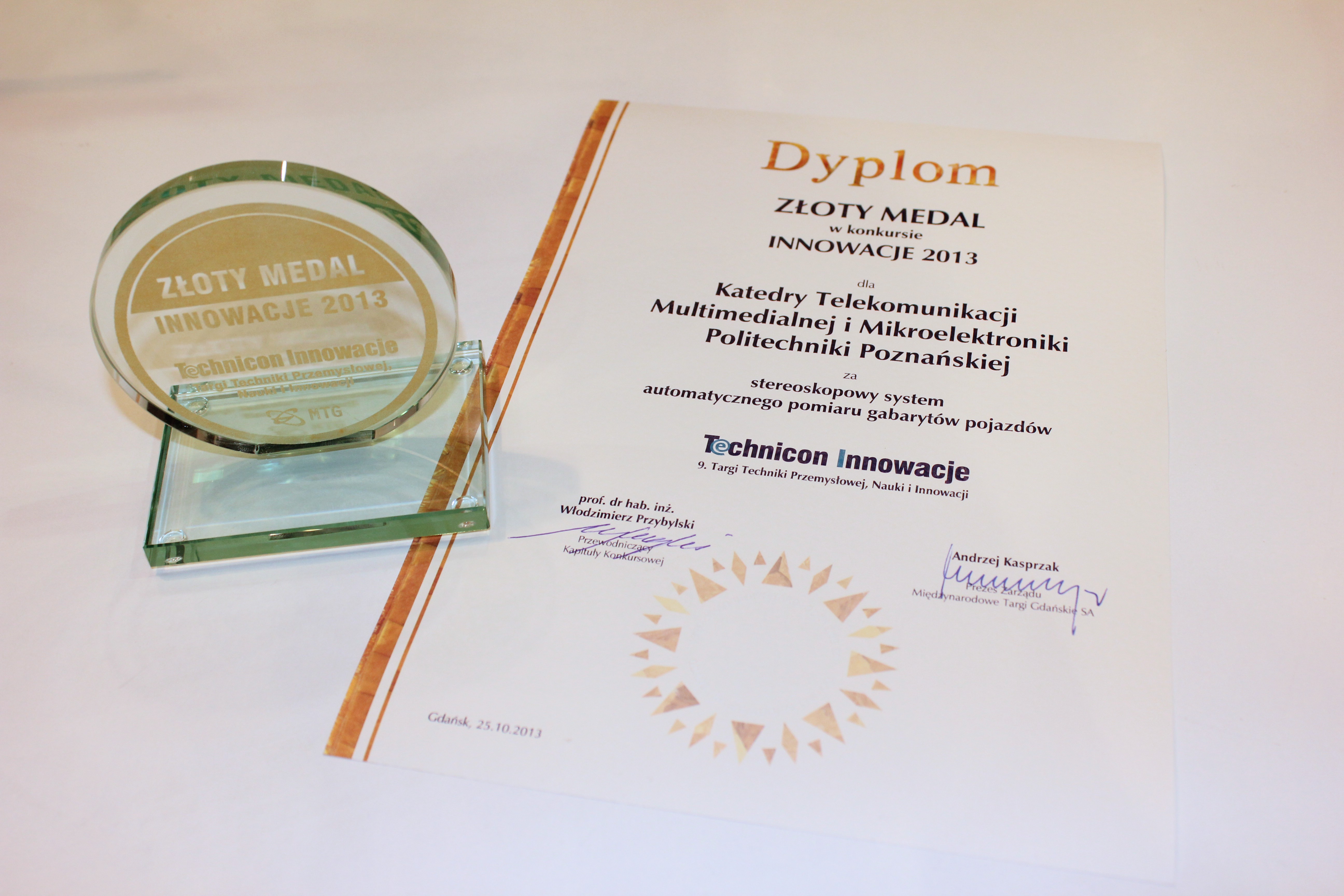 Gold medal in INNOWACJE 2013 contest during 9. Industrial Technology, Science and Innovation Fair TECHNICON-INNOWACJE 2013 for „Stereoskopowy system automatycznego pomiaru gabarytów pojazdów” (Stereoscopic system for automatic measurements of vehicle dimensions) developed by the team of Chair of Multimedia Telecommunications and Electronics: prof. dr hab. inż. Marek Domański, dr inż. Tomasz Grajek, mgr inż. Robert Ratajczak, dr inż. Krzysztof Klimaszewski, mgr inż. Maciej Kurc, mgr inż. Jakub Stankowski, dr inż. Marta Stępniewska, mgr inż. Krzysztof Wegner, inż. Adrian Dziembowski, inż. Dawid Mieloch, inż. Tytus Sielach and in cooperation with Zylia sp. z o.o., Poznań.