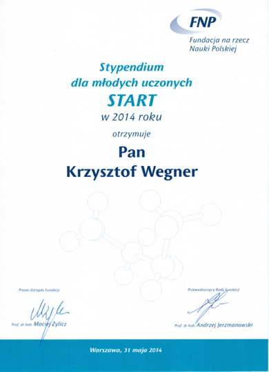 The Foundation for Polish Science distinguished MSc Eng Krzysztof Wegner and awarded him a scholarship in the START programme. The aim of the programme is to distinguish the most talented young researchers and the scholarships serve as recognition of their scientific attainments and as an incentive for further growth by enabling them to devote themselves fully to their research. Candidates are evaluated on the basis of their scientific achievements and the research plans they submit. This year’s scholarship-recipients were chosen from 1250 candidates, the Foundation selected 136 beneficiaries – outstanding young scholars at the beginning of their scientific carreer, who already achieved some success in their field of study.