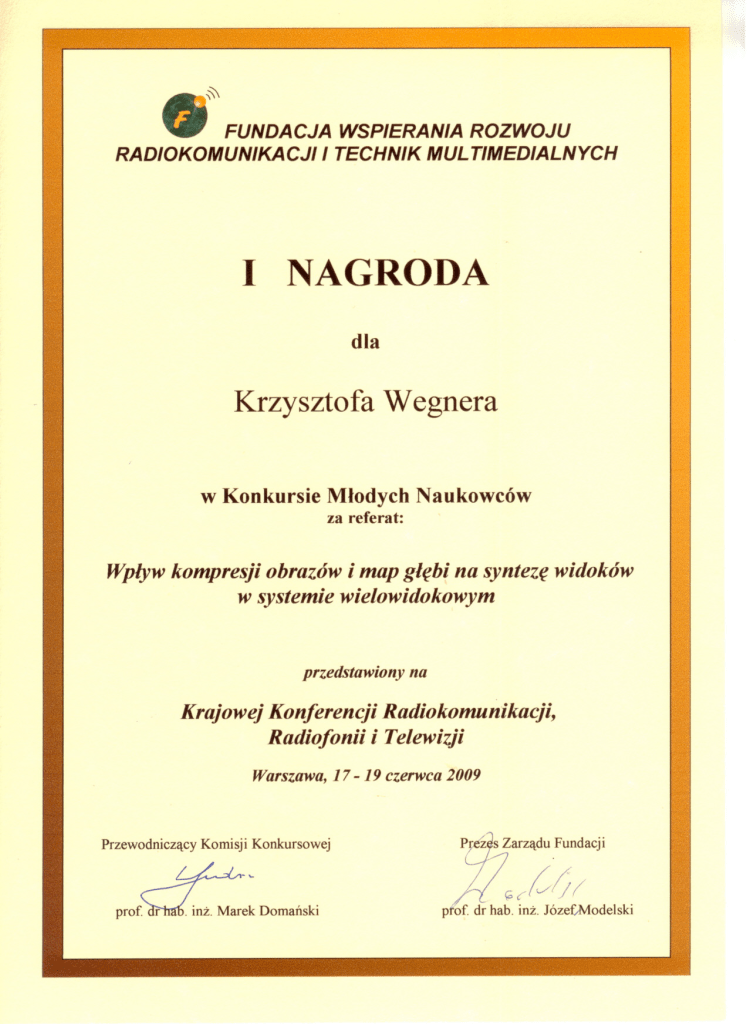 I nagroda w Konkursie Młodych Naukowców organizowany przez Fundację Wspierania Rozwoju Radiokomunikacji i Technik Multimedialnych za referat: „Wpływ kompresji obrazów i map głębi na syntezę widoków w systemie wielowidokowym” przedstawiony na Krajowej Konferencji Radiokomunikacji, Radiofonii i Telewizji, Warszawa, 17 – 19 czerwca 2009