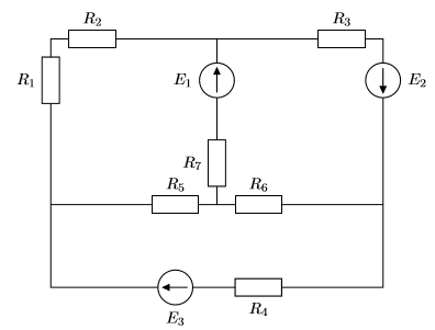 Do obliczeń przyjmij że: $ R_1=1,\Omega$, $ R_2=2,\Omega$, $R_3=3,\Omega$, $ R_4=4,\Omega$, $ R_5=5,\Omega$, $ R_6=6,\Omega$, $ R_7=7,\Omega$, $ \underline{E_1}=\underline{E_3}=1,V$,$ \underline{E_2}=2,V$, $ \omega=2,\frac{rad}{s}$